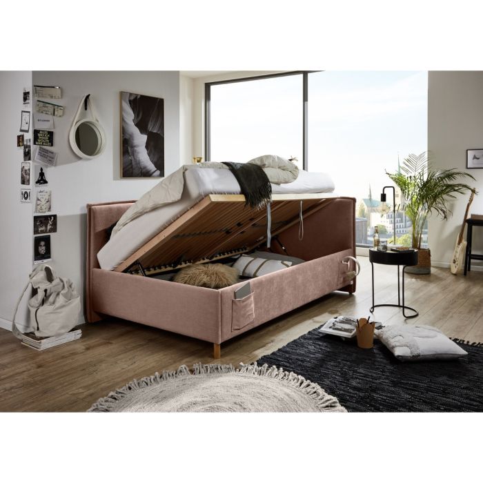 De rugleuning is links of rechts te monteren en biedt extra ondersteuning bij lezen of ontspannen. Onder het ligvlak bevindt zich geïntegreerde opbergruimte voor beddengoed, kussens en seizoensspullen, met twee ingebouwde USB-poorten (USB-A en USB-C) voor extra gemak.